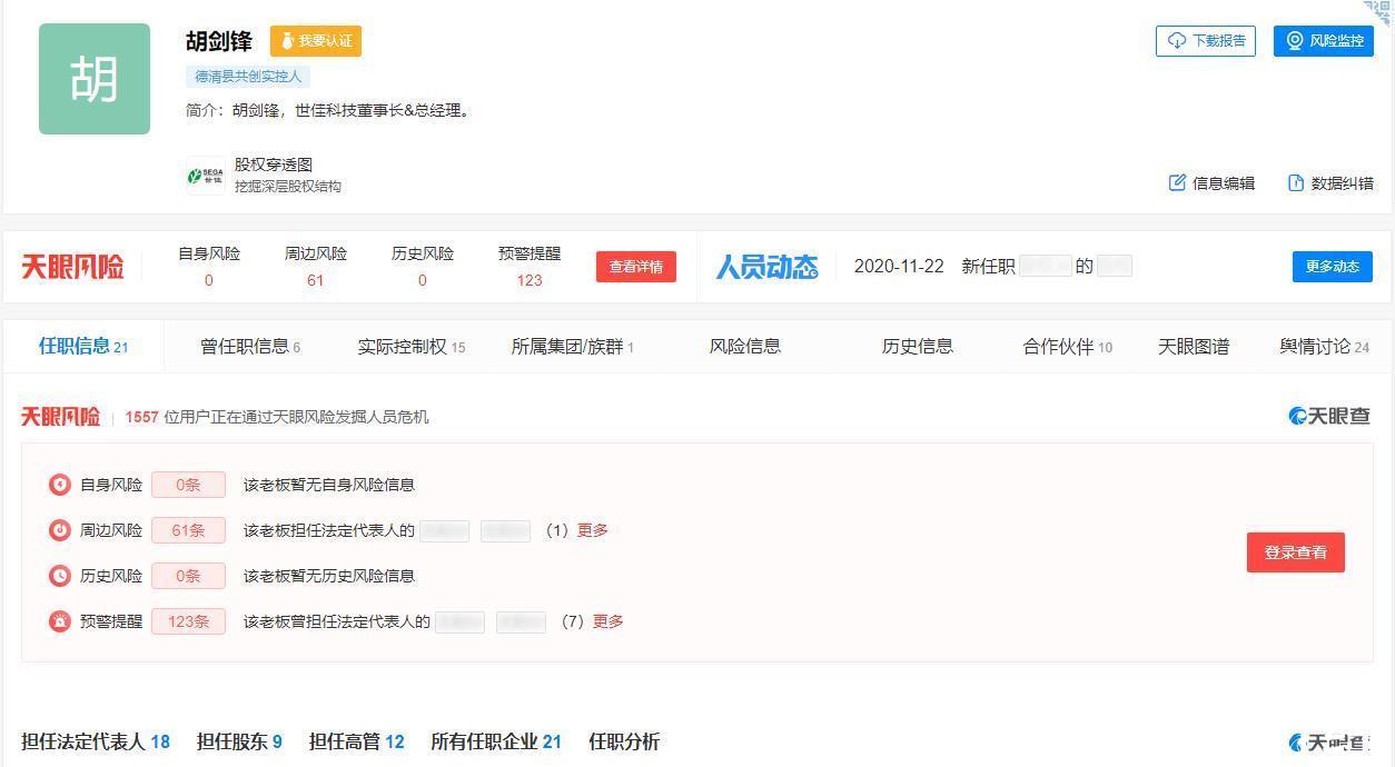 天眼查数据显示,世佳科技董事长、总经理胡剑锋,目前有21条任职信息,担任股东9家企业,担任高管12家,且有实际控制权的企业15家。天眼风险显示,胡剑锋周边风险有61条,预警提醒达123条。
